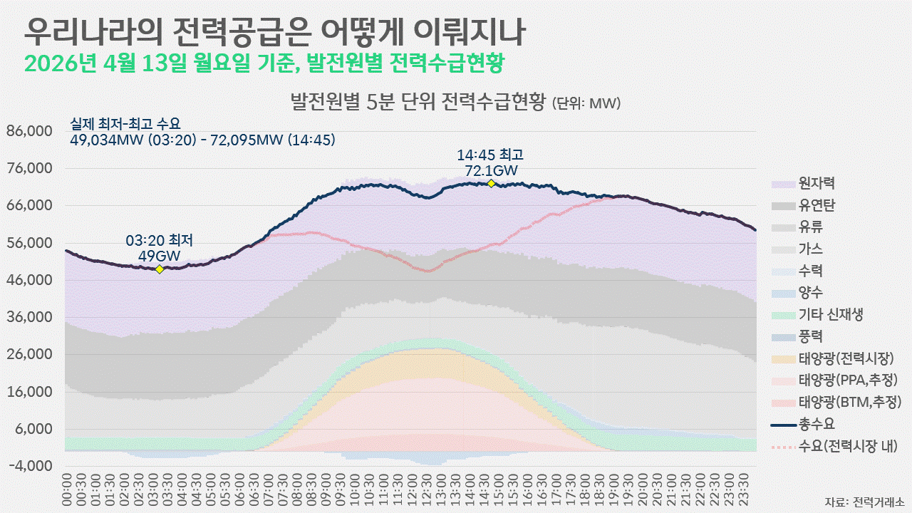 '초여름 날씨'의 첫날이었던 지난 13일의 전력수급 상황을 살펴봤습니다. 이날의 우리나라 실제 전력 수요의 최젓값은 모두가 잠든 새벽 3시 20분, 4만 9,034MW로 기록됐습니다. 수요 피크는 7만 2,095MW(오후 2시 45분)로 기록됐고요. 출근시간 무렵, 70GW대로 올라선 수요는 오전 10시 55분 7만 1,769MW까지 오르다 점심시간 사이 6만 8,170MW(오후 12시 35분)까지 떨어졌으나 이내 이날의 최곳값까지 늘어났죠. 서울 기준, 낮 최고기온이 14~16℃에 머물렀던 전주엔 오전의 수요 피크가 그날의 최곳값이었지만, 낮 기온이 오르면서 일 최고기온이 기록되는 시간, 전력 수요 또한 가장 많아진 겁니다.