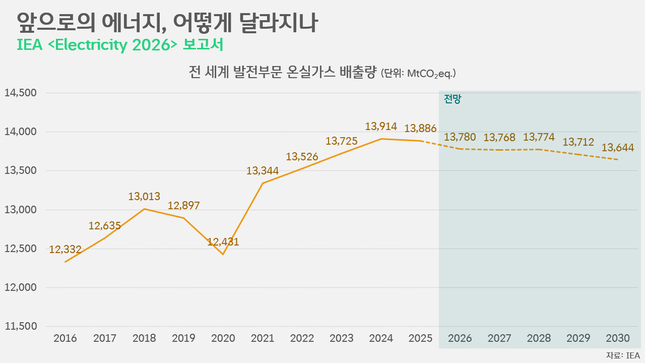 그런데, 팬데믹 이후 일부 선진국 중심에서 진행됐던 에너지전환이 세계 다수 국가로 퍼져나가면서 전력 수요의 증가세 대비 온실가스 배출량의 증가세는 약해졌고, 2025년엔 전력 생산의 증가에도 불구하고 되려 총배출량이 2024년의 139억 1,400만톤에서 138억 8,600만톤으로 줄어드는 모습을 보였죠. IEA(International Energy Agency, 국제에너지기구)는 이러한 흐름이 앞으로도 이어질 것으로 내다봤습니다. 발전량은 지속적으로 늘어나는데, 발전부문의 온실가스 배출량은 2030년 136억 4,400만톤까지 단계적으로 줄어들 것으로 분석된 겁니다.