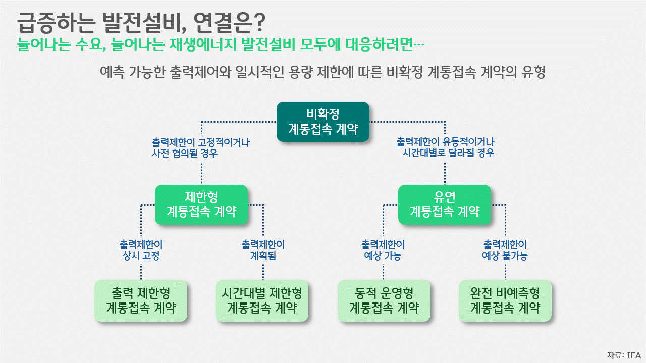 이는 크게 두 개의 카테고리로 구분됩니다. 출력제한이 고정적이거나 사전 협의가 이뤄지는 방식인 '제한형 계통접속 계약', 그리고 출력제한이 유동적이거나 시간대별로 달라질 수 있는 '유연 계통접속 계약'으로 말이죠. 제한형 계통접속 계약의 경우, 출력제한이 상시 고정된 값으로 이뤄지는 '출력 제한형 계통접속 계약'과 출력제한이 계획 하에 이뤄지는 '시간대별 제한형 계통접속 계약'으로 나뉩니다. 유연 계통접속 계약의 경우엔 출력제한이 그나마 예상 가능한 '동적 운영형 계통접속 계약'과 출력제한의 예상이 어려운 '완전 비예측형 계통접속 계약'으로 나뉘게 되죠.