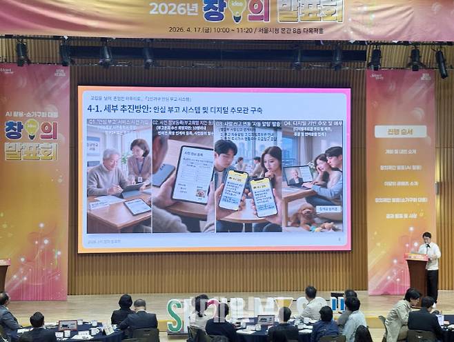 한종석 도봉구청 통신인프라 팀장이 17일 서울시청 본관 다목적홀에서 열린 창의제안 공모전 발표회에서 '안심 부고 시스템'에 대해 설명하고 있다.