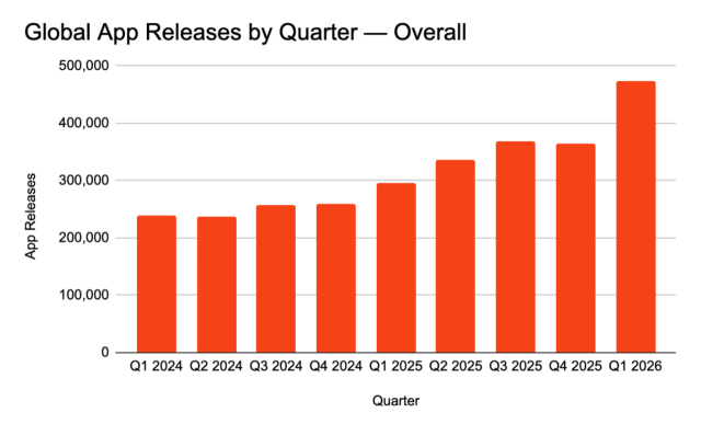 19일(현지시간) 시장조사업체 앱피규어(Appfigures)가 발표한 보고서에 따르면 올해 1분기 전 세계 앱 출시량은 전년 동기 대비 60% 증가했다. 특히 애플의 iOS 앱스토어만 떼어놓고 보면 증가율은 80%에 달하며, 4월 들어서는 양대 마켓 전체 출시량이 전년 대비 104% 폭증하는 등 폭발적인 성장세를 기록 중이다. 이는 챗봇이나 AI 에이전트가 앱을 대체할 것이라던 업계의 예측을 뒤집는 결과다.