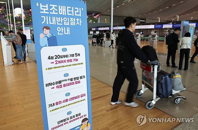 (영종도=연합뉴스) 김주형 기자 = 항공기에 들고 탈 수 있는 보조배터리 개수가 최대 2개(용량 160Wh 이하)로 제한된 20일 인천국제공항 카운터 앞에 관련 안내문이 세워져 있다.