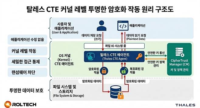 비정형 데이터는 크기와 형식이 다양해 기존 애플리케이션 단에서 암호화를 적용하면 성능 저하와 정합성 문제가 발생한다. 탈레스의 CTE(CipherTrust Transparent Encryption)는 OS 커널 레벨에서 동작해 애플리케이션 수정이나 개발 공수 없이 파일과 디렉터리를 투명하게 암호화해 서비스 무중단을 보장한다.