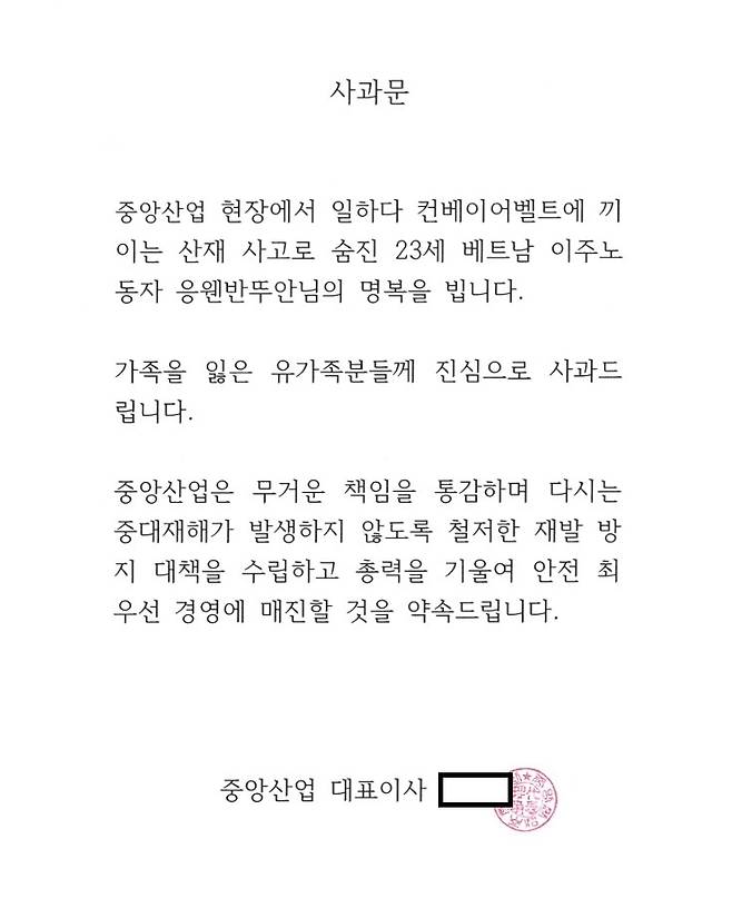 중앙산업은 사과문에서 "중앙산업 현장에서 일하다 컨베이어 벨트에 끼이는 산재 사고로 숨진 23세 베트남 이주노동자 응웬반뚜안님의 명복을 빈다"라며 "가족을 잃은 유가족분들께 진심으로 사과드린다"라고 밝혔다.
