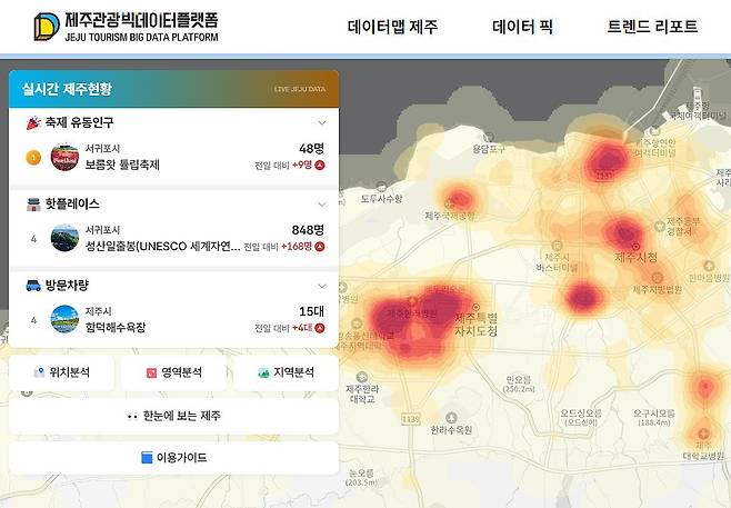 '데이터맵 제주'에서는 소비와 이동, 방문 관광객의 현황을 한눈에 확인할 수 있다. 화면에서는 축제 유동 인구, 핫플레이스, 방문 차량 수가 실시간으로 표출된다.