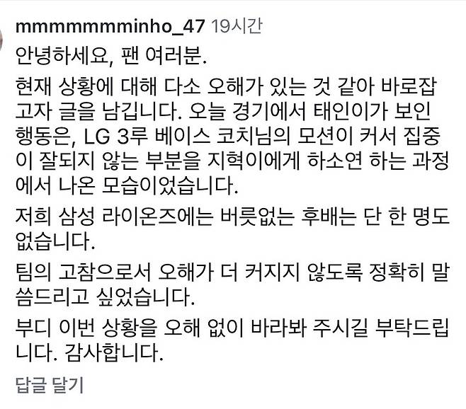 강민호는 "다소 오해가 있는 것 같아 바로잡고자 글을 남긴다"라며 "오늘 경기에서 (원)태인이가 보인 행동은 LG 3루 베이스 코치의 큰 움직임으로 인해 집중이 흐트러진 상황을 (류)지혁이에게 하소연하는 과정에서 나온 것"이라고 설명했다. 이어 "삼성 라이온즈에 버릇없는 후배는 단 한 명도 없다. 팀의 고참으로서 오해를 잡아야 한다고 생각해 말씀드린다"라고 덧붙였다.