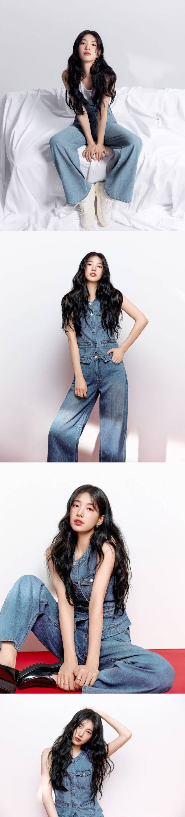 수지는 화이트 배경 위에서 데님만으로 이번 캠페인을 완성했다. 미니멀한 연출을 통해 데님 본연의 매력을 강조한다. 슬리브리스 톱과 부츠컷 데님, 오버롤, 데님 베스트와 와이드 팬츠 등 통일된 무드로 데님 중심의 여름 룩을 제안한다.