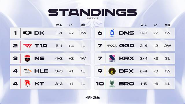 3주차 비방송 경기까지 마친 결과, 디플러스 기아가 티원 이스포츠 아카데미를 2대 0으로 제압하고 승점 7점으로 단독 선두를 차지했다. 티원 이스포츠 아카데미는 승점 4점으로 2위, 농심 레드포스는 승점 2점으로 3위에 자리했다.