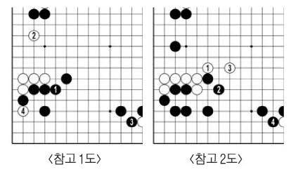 흑39로 <참고 1도> 1, 3으로 아래쪽을 키우려 하면 백4를 불러 귀가 다친다. 백44가 아닌 <참고 2도> 1이라면 아래쪽에서 흑 모양이 커진다.