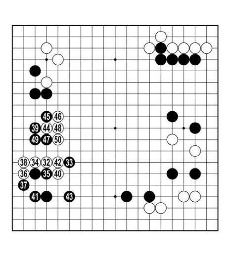 백32가 날아오자 더 높은 곳에 흑33을 띄웠다. 공격 효과로 흑은 아래쪽과 왼쪽에서 집을 벌었다. 백은 가운데에서 힘을 얻었다. 형세는 팽팽하다.