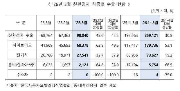 수출 증가의 중심에는 하이브리드차가 있었다. 3월 하이브리드차 수출액은 17억 8000만달러로 전년 대비 79% 급증하며 전체 친환경차 수출 증가를 견인했다. 친환경차 전체 수출도 9만 8040대로 42.6% 늘어 자동차 산업의 구조 전환 흐름을 명확히 보여줬다.