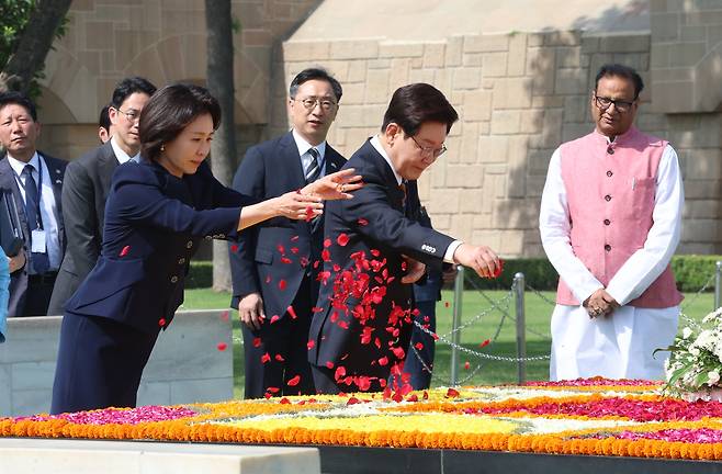 | ▲ 이재명 대통령과 김혜경 여사가 20일(현지시간) 인도 뉴델리 간디 추모공원에서 헌화하고 있다. 2026.4.20 |