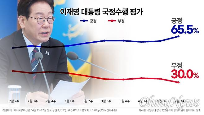 - 이 모든 상황을 떠나, 이재명 대통령의 국정수행 긍정 평가는 오늘(20일)도 고공행진 중이다. 리얼미터-에너지경제신문 조사에서 65.5% 기록, 취임 후 최고치를 찍었다. 부정 30.0%, 모름 4.5%. 리얼미터는 "중동 위기 속 원유 대량 확보 및 코스피 6,200선 회복 등 경제, 에너지 안보 성과가 지지율을 견인했다"고 분석했다. 이번 조사에서는 20대(8.3%p↑, 50.1%)와 중도층(7.4%p↑, 69.1%)에서 상승폭이 눈에 띄었는데, 리얼미터는 "이스라엘에 대한 강경 인권 발언, 현직 대통령 최초 세월호 12주기 참석 등으로 중도층과 청년층의 지지를 확대했다"고 평가했다.