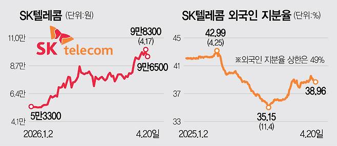 하나증권은 최근 국내 증권사 중 SKT 목표주가를 14만 원으로 가장 높게 제시하기도 했다. 김홍식 하나증권 연구원은 “5G SA(단독모드) 시대로의 진입이 본격화되고 있음을 감안하면 여전히 매력적인 주가 수준”이라며 “외국인 보유 비중이 낮은 SKT로 투자자들의 매수세가 유입될 가능성이 높다”고 분석했다. 통신 3사의 외국인 지분율은 최대 49%로 제한되는데 KT는 외국인 지분율 한도를 꽉 채웠다. LG유플러스는 외국인 지분율이 41.93%로 SKT보다 약 3%포인트 높다.