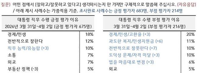 한국갤럽의 4월 여론조사 결과를 찾아봤습니다. 대통령의 직무수행을 평가할 때 긍정적, 부정적 요인을 꼽는 항목에서 '외교'가 어떤 점수를 받았는지 살펴보는 게 '잇따른 외교 참사로 대한민국이 심각한 위기에 직면해 있다'는 장 대표 주장이 현실에 부합하는지 판단하는 데 도움이 될 수 있기 때문입니다. 4월 첫째 주에 대통령 직무수행을 부정적으로 평가한 응답자들 가운데 외교를 꼽은 것은 5%에 불과했습니다. 아래 표에 보이는 것처럼 높은 순위는 아닙니다. 4월 둘째 주에는 6%로 비슷했습니다. 반면, 이 주에 대통령 직무수행을 긍정적으로 평가한 응답자들 가운데 12%는 '외교'를 잘하는 항목으로 꼽았습니다. 4월 둘째 주가 장 대표가 미국으로 떠난 시점입니다. 따라서, '외교 참사'를 방미의 이유로 제시한 장 대표의 주장은 설득력이 크지 않습니다. 4월 셋째 주 한국갤럽의 여론조사에서 대통령 직무수행 부정 평가자 가운데 외교를 꼽은 응답은 12%로 늘었습니다. 이 대통령의 이스라엘 관련 글이 찬반 논란을 빚은 것이 영향을 준 것으로 보입니다.