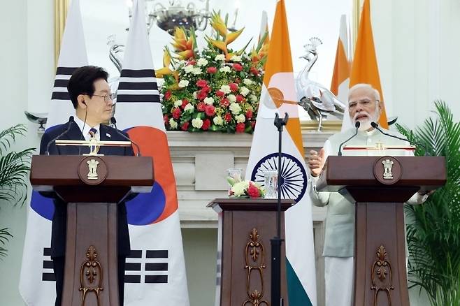 [이재명 대통령과 나렌드라 모디 인도 총리가 20일(현지시간) 뉴델리 영빈관에서 공동언론발표를 하고 있다. (뉴델리=연합뉴스)]