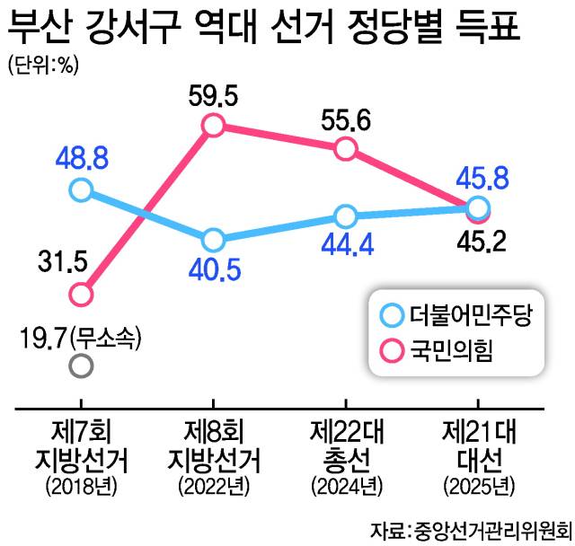 특히 강서구는 직전 대선에서 부산 16개 구·군 가운데 이재명 대통령이 유일하게 승리한 지역구다. 이 대통령은 강서구에서 45.75% 득표율을 얻어 국민의힘 김문수 후보(45.17%)에 0.58%포인트(P) 앞섰다.