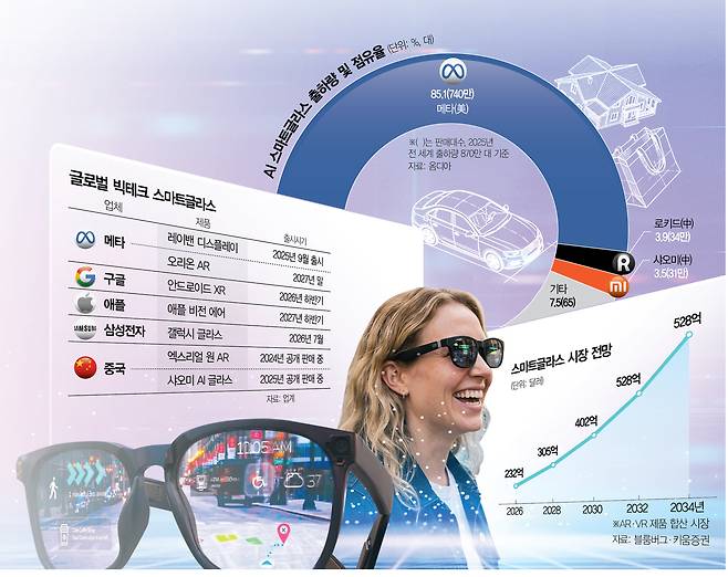 2위인 중국의 로키드(34만 대·3.9%)와 3위 샤오미(30만 대·3.5%)는 메타와 격차가 약 20~25배에 달한다. 중국 정부가 스마트글라스 속도전에 나선 배경에도 2040년 2000억 달러(약 300조 원)로 성장할 글로벌 시장에서 미국 기업에 주도권을 내줄 수 없다는 위기감이 깔려 있다.
