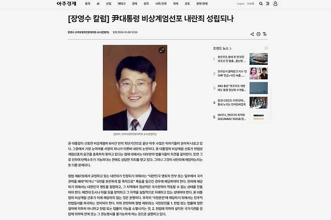 | ▲ 2024년 12월 5일 자 <아주경제[>에 실린 "[장영수 칼럼] 尹대통령 비상계엄선포 내란죄 성립되나" |