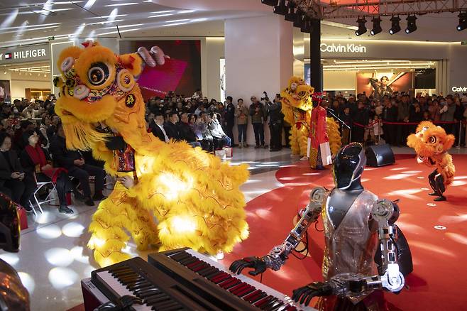 | ▲ 지난 2월 19일 중국 베이징에서 열린 춘절 축하 로봇 박람회 행사 개막식에서 인간 공연자와 로봇이 함께 사자춤에 참여하고 있다. |