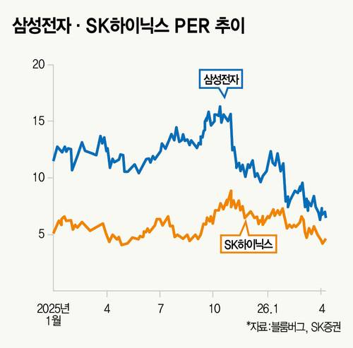 대신증권에 따르면, 올해 영업이익 추정치 기준 삼성전자와 SK하이닉스 PER은 각각 4.8배, 3.9배에 불과하다. 내년 실적 추정치를 기준으로 하면 각각 4배, 3.1배까지 떨어진다. 경쟁사 마이크론(약 22배)은 물론, 반도체 업종 평균(약 24배)과 비교해 차이가 크다.