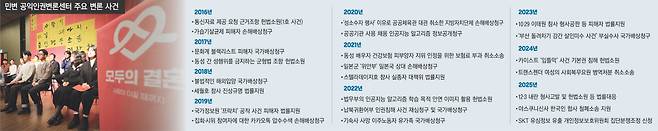 센터는 공익사건이 접수됐을 때나 긴급한 권리 구제가 필요한 상황일 때 민변 변호사들을 이어주는 ‘허브’ 역할을 한다. 200명이 넘는 변호사가 각 분야에서 연결돼 있고, 센터를 통해 사회적으로 의미가 큰 사건에 함께 대응하며 힘을 실어준다.