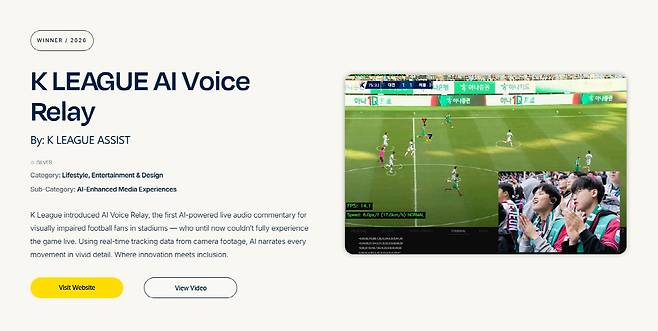 AI 음성 중계는 지난해 11월 대전월드컵경기장에서 열린 K리그1 35라운드 대전하나시티즌과 FC서울 경기에서 처음 시범 운영됐다. 당시 시각장애인 축구팬 한종민군과 쌍둥이 동생 한종서군을 초청해 직접 체험할 수 있도록 했다. 한국프로축구연맹은 "이번 수상은 단순한 기술 성과를 넘어 누구나 함께 즐길 수 있는 스포츠의 가치를 국제적으로 인정받았다는 점에서 주목할 만하다"며 "특히 장애인의 달인 4월에 이뤄졌다는 점에서도 상징성이 크며, AI 음성중계 기술을 실제 경기장에 구현해 스포츠 관람 접근성을 높이고 사회적 포용 가치를 실현한 성과로 평가된다"고 밝혔다.