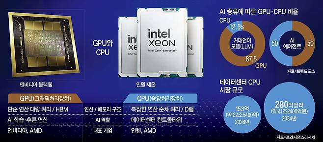 상황을 바꾼 것은 AI 에이전트의 대두다. 기존 거대언어모델(LLM)은 질문을 하면 답을 내놓는 비교적 단순한 형태였지만, AI 에이전트는 작업을 계획하고 외부 도구를 호출하는 등 더욱 복잡한 작업을 많이 수행해야 한다. ‘오케스트레이션(조율)’ 작업을 할 지휘관, 즉 CPU의 수요도 폭증한 배경이다. 시장조사 업체 트렌드포스는 “기존 AI 데이터센터에는 GW(기가와트)당 CPU 코어(연산 처리 장치) 수가 3000만개 필요했지만, AI 에이전트 시대에는 1억2000만개로 급증할 것”이라며 “CPU와 GPU의 비율도 1대1 내지는 1대2로 변화할 것”이라고 했다.