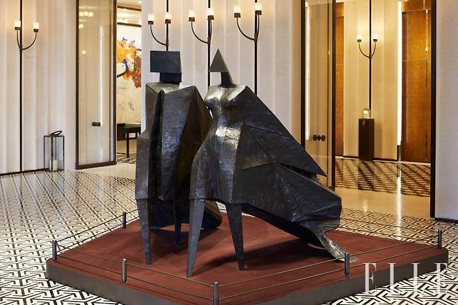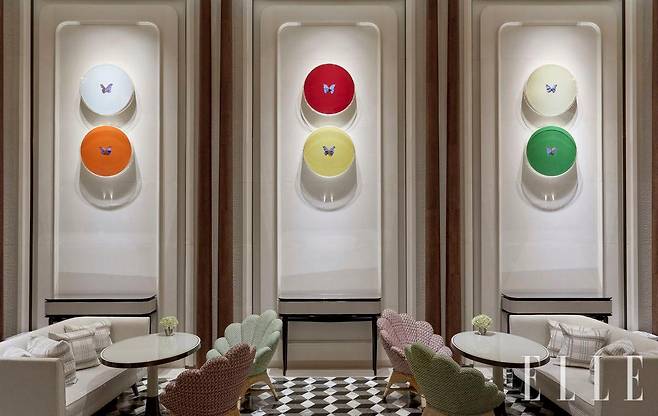 “어른이 되면서 잃어 버리는 것 중 가장 소중한 것은 경이로움을 느끼는 능력 같아요. 홍콩의 가장 강력한 문화적 상징인 ‘복(福)’, 번영을 상징하는 숫자 ‘8’, 붉은 색, 용 을 여덟 살 아이의 눈으로 다시 보고 싶었습니다. 가장 직관적이고 단순한 눈으로 말이에요.” 프랭키는 자신의 어린시절 상상력을 길러준 영화 〈피트의 드래곤〉 〈고스트 버스터즈〉 〈백 투 더 퓨처〉, 책 〈괴물들이 사는 나라〉 등의 문화 코드를 결합해 ‘러키 드래곤’을 완성했다고 덧붙였다. 이 밖에도 로즈우드 홍콩에선 눈길 닿는 곳마다 방대한 아트 컬렉션과 마주할 수 있다. 로비에선 린 채드윅의 ‘Pair of Walking Figures– Jubilee’(1977)가 반겼고, 애프터눈 티 플레이스인 ‘더 버터플라이 룸’에 들어서면 데미언 허스트의 ‘Zodiac’ 콜렉션이 한쪽 벽에 가득했다.