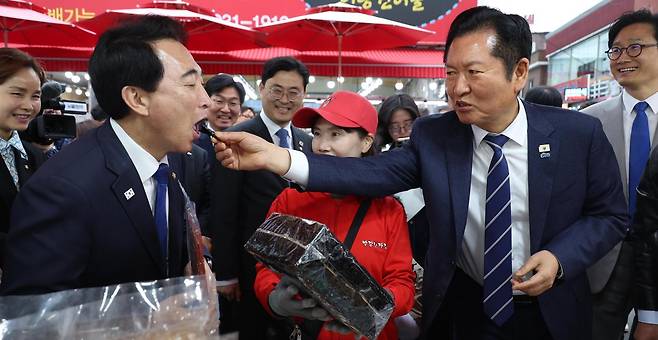 | 장동혁 고향 찾은 정청래 더불어민주당 정청래 대표(앞줄 오른쪽)가 20일 충남 보령시 대천항수산시장을 방문해 박수현 충남도지사 후보에게 돌김을 먹여주고 있다. 정 대표는 이날 국민의힘 장동혁 대표 지역구인 보령시에서 현장 최고위원회의를 열고 “(장 대표가) 당내 입지가 흔들리자 미국으로 건너가 주요 인사들과 사진을 찍어 위기를 돌파해 보려고 했나 보다”라고 지적했다. 보령=뉴시스 |