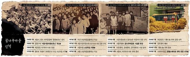 시립아동보호소 시절 최고 2328명(1966년)까지 인원이 치솟았다. 만성적 과밀 수용 상태(정원 1천명)였던 보호소는 아동 중에서 ‘통장’과 ‘실장’을 뽑아 통제했다. ‘부랑아 수용 시대’의 흔적은 ‘양육과 돌봄의 시대’에도 말끔히 지워지지 않았다. 10년 전 꿈나무마을에선 그 역할을 ‘형’이 대신했다. (2회 ‘밖이 알려준 것’에서 계속)
