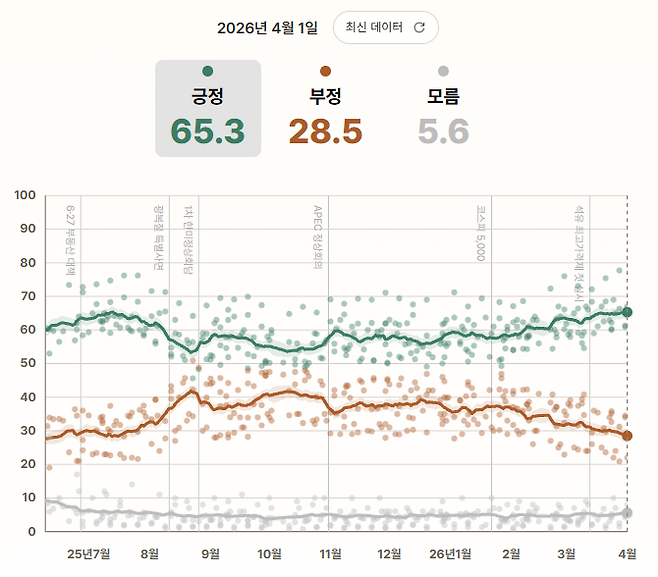 아래 인터랙티브 뉴스 사이트에 접속하시면, 이재명 대통령 취임 직후인 지난해 6월부터 조사기관별로 발표된 국정 수행 지지율과 정당 지지율을 모아서 ‘베이지안 추론’이라는 통계적 방법을 사용해 추정된 추정 지지율을 확인하실 수 있습니다.