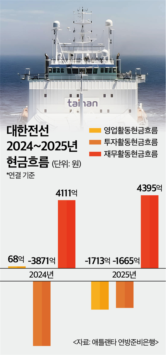 대한전선의 최근 3개년 현금흐름 추이를 보면 재무활동을 통한 자금조달 의존도가 지속적으로 상승하고 있다는 것을 알 수 있다. 재무활동현금흐름은 2023년 973억원에서 2024년 4111억원까지 급증한 데 이어 지난해에는 4395억원으로 3년 연속 플러스(+)를 기록했다.