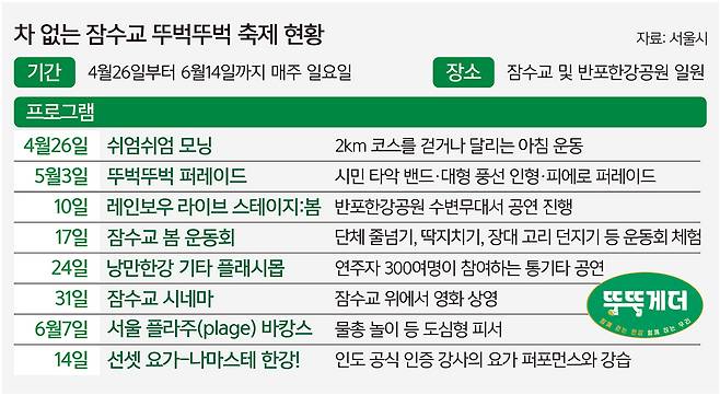 첫날인 26일에는 오전 7시부터 9시까지 반포한강공원 달빛광장에서 잠수교 남단을 거쳐 북단을 반환하는 약 2㎞ 구간을 걷거나 달리는 ‘쉬엄쉬엄 모닝’을 진행한다. 같은 날 오전 6시30분부터 9시30분까지는 ‘찾아가는 서울체력장’이 열리고, 오전 11시부터 오후 6시까지는 푸드트럭, 플리마켓, 쉼터 등을 운영한다.