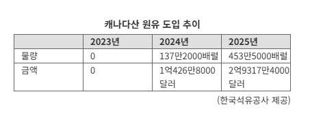 실제 도입도 빠르게 늘고 있다. 한국의 캐나다산 원유 수입은 2023년 '0'에서 출발해 2025년 453만5000배럴까지 확대됐다. 금액 기준으로는 2억9317만달러 규모다.