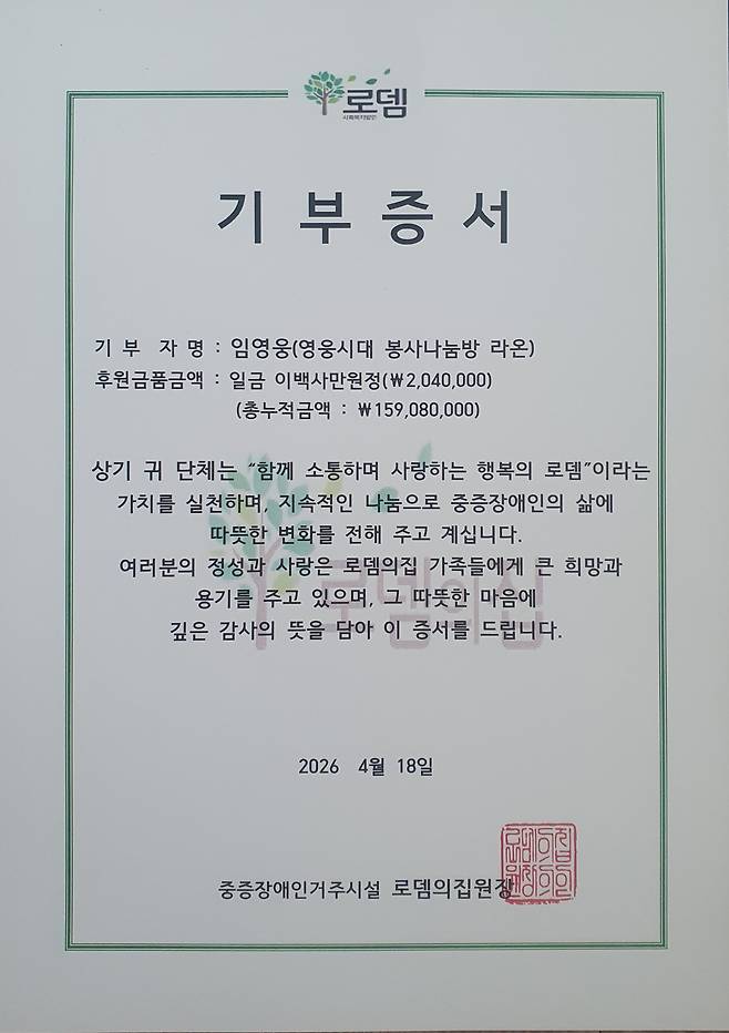 가수 임영웅 팬클럽 ‘영웅시대 봉사나눔방 라온’은 18일 경기도 양평에 위치한 중증장애아동 거주 시설 ‘로뎀의집’을 찾아 제58회 급식 봉사와 함께 204만 원의 후원금을 전달했다.