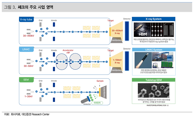 대신증권 ‘쎄크 작지만 기술력 있는 멀티플 확장형 회사’ 보고서에 따르면 쎄크는 산업용 전자빔 기술을 기반으로 엑스레이 튜브(X-ray Tube), 반도체·배터리용 검사장비, 방산용 선형가속기(LINAC), 탁상형 전자현미경(SEM) 등을 자체 개발·생산하는 기업이다. 핵심 부품부터 장비까지 내재화한 수직계열화 구조를 통해 원가 경쟁력과 공급 안정성을 동시에 확보한 점이 차별화 요소로 꼽힌다.