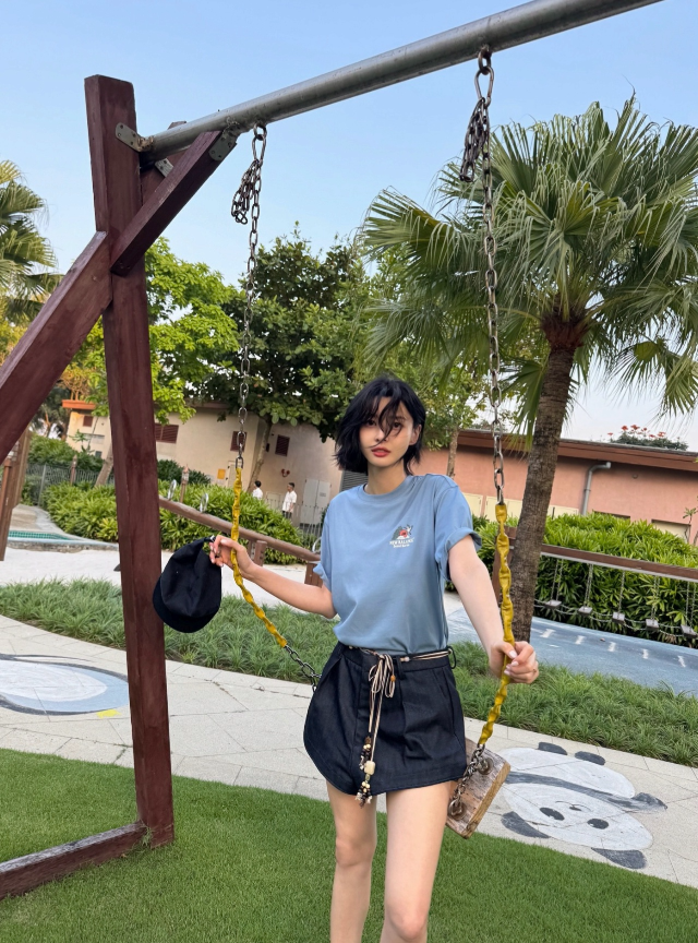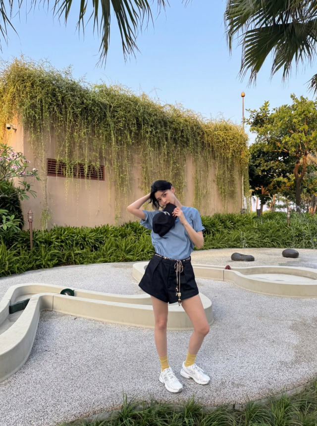 공개된 사진 속 그는 야외 정원을 배경으로 그네를 잡은 채 자연스러운 포즈를 취하고 있다. 블루 톤 티셔츠에 짧은 팬츠를 매치한 편안한 차림이지만, 드러난 각선미와 균형 잡힌 비율이 단번에 눈길을 끈다.