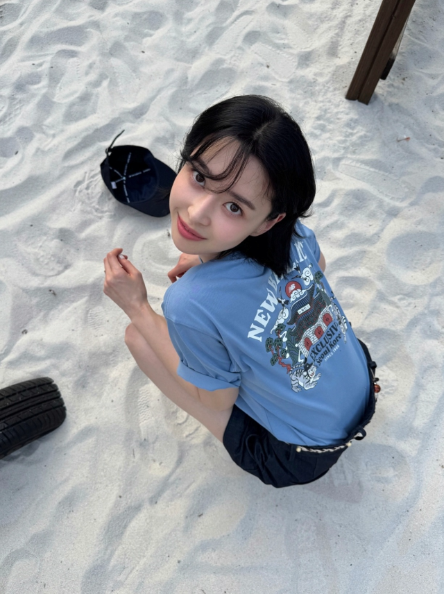 또 다른 사진에서는 모자를 들고 장난기 있는 포즈를 취하거나, 모래 위에 앉아 카메라를 올려다보는 등 다양한 분위기를 연출했다. 꾸민 듯 꾸미지 않은 자연스러운 스타일링에도 모델 같은 핏이 살아나며 ‘꾸안꾸’ 매력을 더했다.