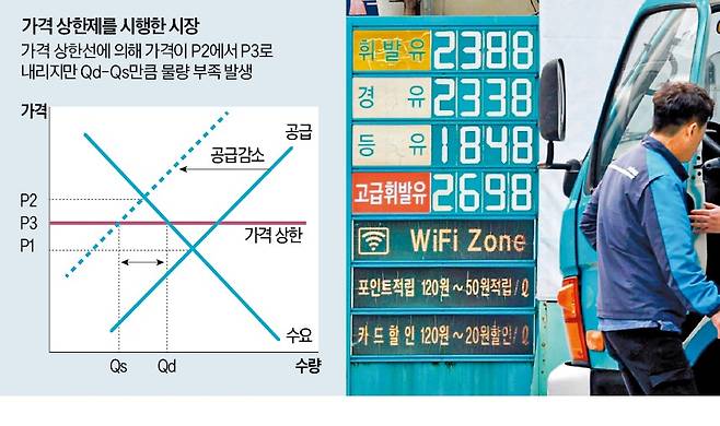 “대기 줄이 길어요.” 맛집 리뷰에 올라온 글이 아니다. 주유소 방문 후기다. 미국·이란 전쟁의 영향으로 석유 가격이 급등한 탓에 기름값이 조금이라도 싼 주유소에 차량 행렬이 길게 이어지는 진풍경이 벌어진다. 정부는 석유 제품 최고가격제를 시행해 가격 상승을 최대한 억제하고 있다. 최고가격제, 즉 가격상한제는 재화 및 서비스의 가격이 급등하거나 시장균형가격이 뭔가 공정해 보이지 않을 때 정치인과 공무원이 가장 손쉽게 꺼내 드는 수단이다. 그러나 가격상한제는 종종 뜻하지 않은 결말을 맞곤 했다.