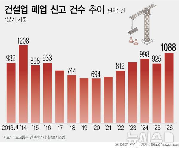 [서울=뉴시스] 21일 국토교통부 건설산업지식정보시스템(KISCON)에 따르면 올해 1분기(1∼3월) 건설업체 폐업 건수는 1088건으로, 12년 만에 다시 1000건대를 기록했다. 국내 건설경기 침체에 중동 전쟁 여파까지 겹친 영향으로 풀이된다. (그래픽=전진우 기자)