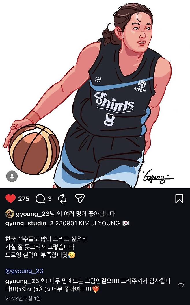 늘 이 작가의 그림을 매일 같이 팔로우한 후 바라보던 자가 김지영이었다. “이규영 작가님! 인스타그램에서 일러스트를 하시는 분인데, 완전 대형 작가님…! 즉 되게 유명한 작가님이세요. 그림도 되게 아기자기하고 예뻐서 팔로우 하고 보고 있었어요. 그런데 이 분이 저를 사로잡은 건, 농구 계정이 따로 있던 점이었어요.”