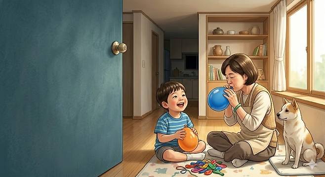 | ▲ 아이의 웃음으로 채워지는 거실 첫째 아이와 풍선을 불며 교감하는 평온한 일상의 한때입니다. AI 생성 이미지 |