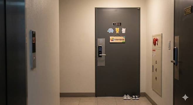 | ▲ 현관문 벨을 누르기 전, 설레는 마음으로 마주한 현관문입니다. AI 생성 이미지 |