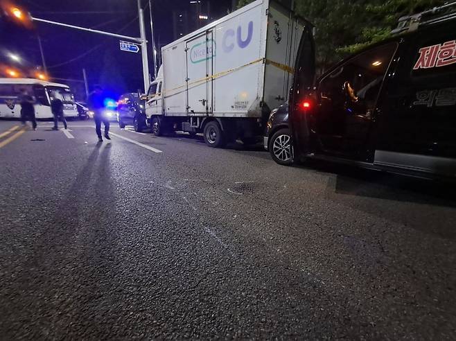 배 본부장의 뒤로 고인을 친 2.5톤 탑차의 모습이 보였다. 폴리스 라인이 쳐진 해당 차량의 앞뒤로 경찰의 견인 시도를 막기 위해 화물연대 차량이 서 있었다. 차량 주변에는 사고 현장을 표시한 흔적이 고스란히 남아 있었다.