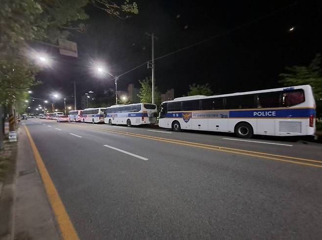 | ▲ CU물류센터로 향하는 길목마다 경찰 버스들이 줄지어 서 있었다. 현장으로 향하는 사거리에서는 경찰들이 차량을 통제하고 있었다. 물류센터로 갈수록 경찰 버스와 함께 '화물연대 00지부'라는 이름이 적힌 차량들이 보이기 시작했고, 저 멀리 "서OO을 살려내라"라는 확성기 소리가 기자를 맞이했다. |