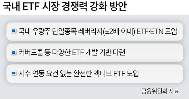 한 금융투자업계 관계자는 “국내 단일 종목 ETF 출시에 앞서 교육을 수강할 수 있도록 이달 중 프로그램을 개설되는 것으로 알고 있다”고 말했다. 이 밖에도 정부는 단일종목 레버리지 ETF 허용 등을 비롯해 ETF 시장 전반을 손질한다. 커버드콜 등 배당형 ETF 확대를 위한 옵션시장 개선도 추진한다. 코스피200·코스닥150 지수 위클리 옵션 만기를 주 5일(월~금)로 확대하고, 개별 국내 주식과 국내 투자 ETF를 기초로 한 위클리·매월 만기 옵션을 새로 도입한다.