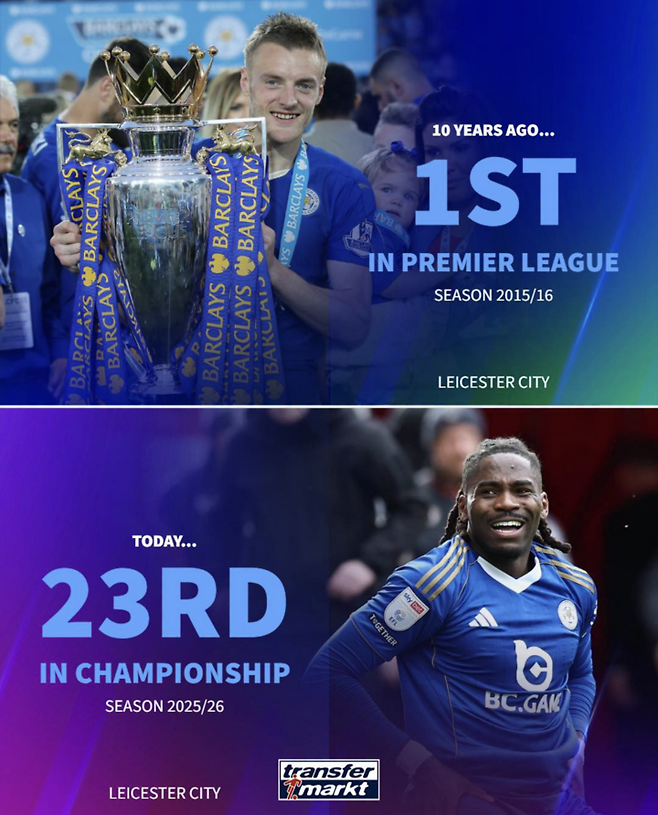 - '동화 우승' 10주년에 '3부 강등' 확정…레스터 시티, 운명의 장난 같은 충격 시나리오 등장 [찬기