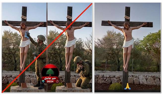 예수상을 망치로 파괴했던 이스라엘군 병사가 복원한 예수상을 수건을 닦는 모습과 무릎 꿇고 사과하는 장면이 담긴 사진 2장으로, 레바논 국기 형태의 '속보 24/24'라는 로고도 들어가 있어 마치 레바논 현지 언론에서 보도한 것처럼 보인다.