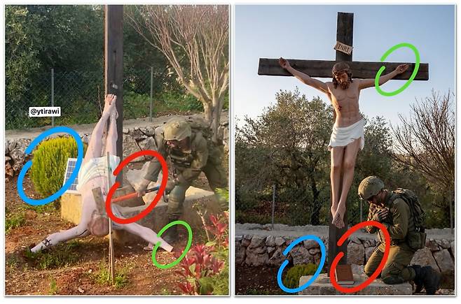 | ▲ 이스라엘군 병사의 파괴 당시 사진(왼쪽)과 조작한 사진(오른쪽)을 비교하면 예수상이 파괴 행위 이전과 다름없는 원형을 그대로 유지하고 있고, 파괴 당시 우물 형태였던 받침대 모습과 주변 나무 모습도 차이가 있다(양쪽 사진 비교를 위한 색이 들어간 원 표시는 오마이뉴스에서 함) |